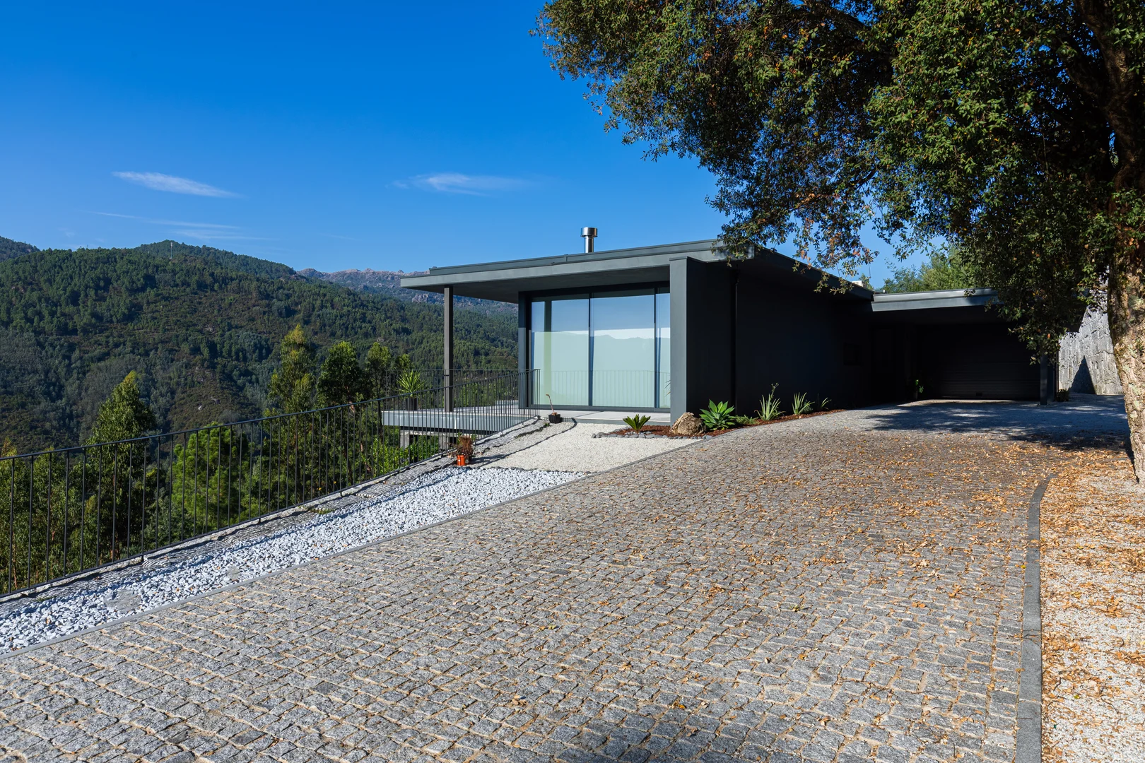 The project is located in Louredo, Gerês, offering breathtaking panoramic views of the Cávado River and the Peneda-Gerês National Park. The house is set on a plateau, and the floor extends into the landscape, creating a seamless connection between the built environment and the terrain.